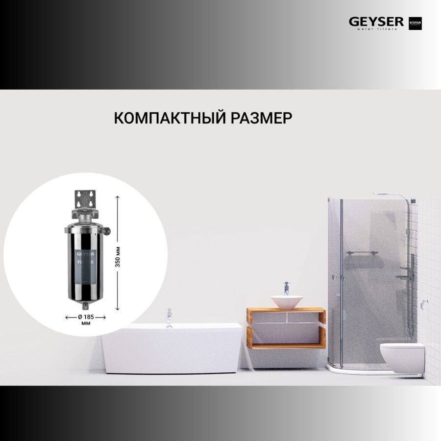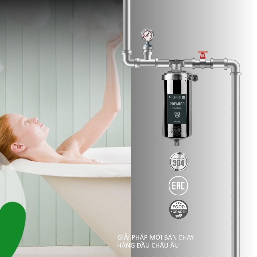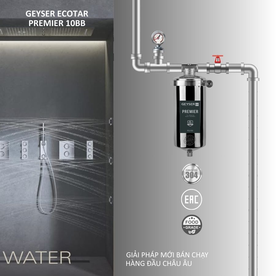 Cột lọc nước sinh hoạt phòng tắm Geyser Ecotar Premier 10BB là sản phẩm thuộc tập đoàn Geyser Liên Bang Nga. Sản phẩm được sử dụng lọc nước nóng lạnh để tắm, nước sinh hoạt đầu nguồn cục bộ(lavabo, máy giặt, máy rửa bát, sen vòi, bồn tắm,…), nước pha chế đồ uống khách sạn,…công suất lọc tới 1.500 lít/h, lọc nhiệt độ nước đến 95oC, khả năng chịu áp lực nước lên tới 40 Bar, inox 304 an toàn tuyệt đối trong quá trình sử dụng.