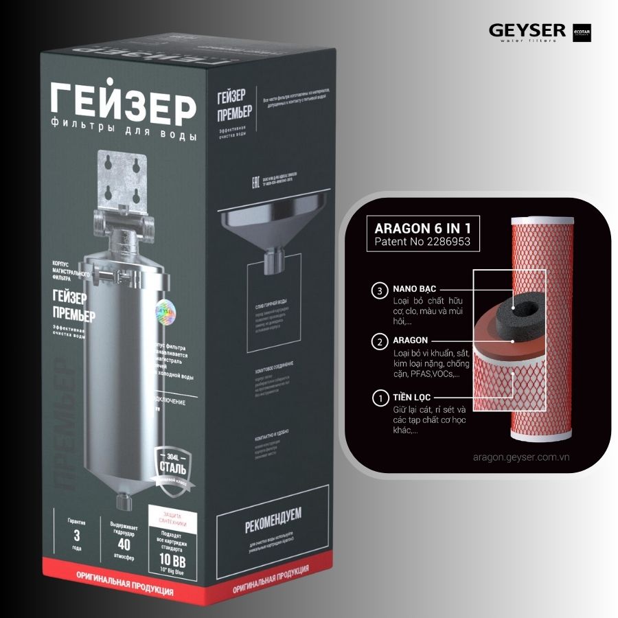 Tích hợp công nghệ lọc tổng hợp độc quyền của Geyser LB Nga. Công nghệ lọc 6 in 1 chưa từng có, mang lại năng lực xử lý mạnh mẽ vượt trội mà không cần phải tăng số lượng lõi lọc như các hệ thống lọc thông thường.