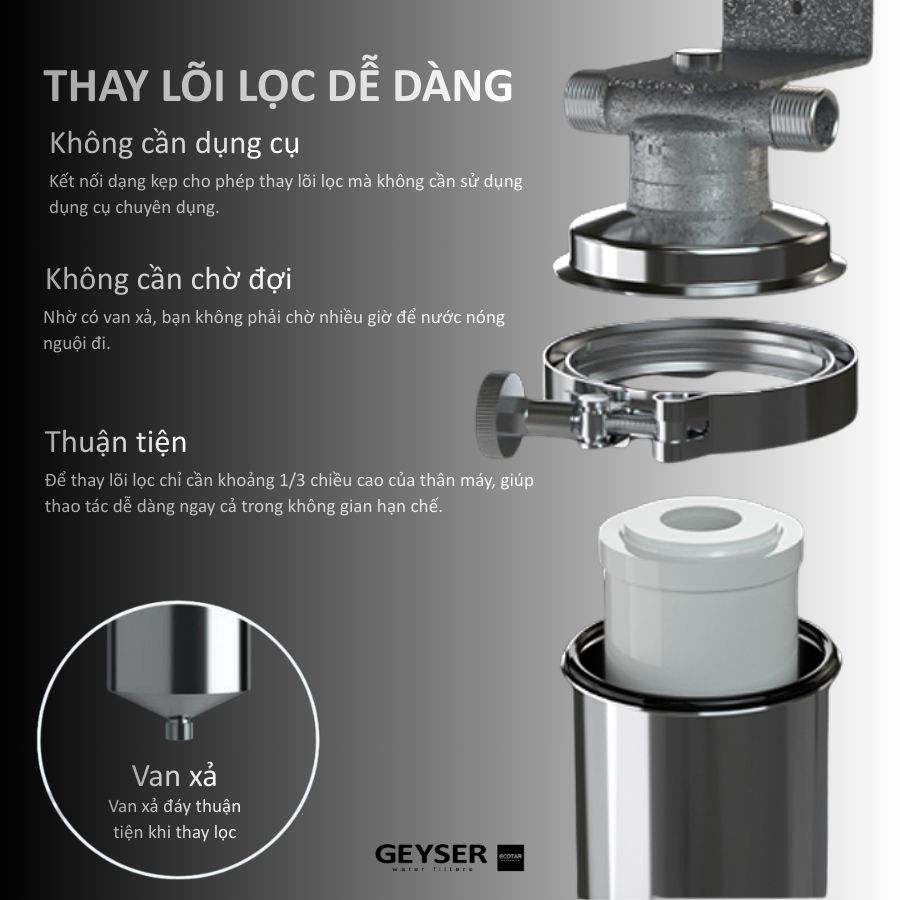 - Dễ dàng vặn xả cặn bẩn trong máy, góp phần nâng cao tuổi thọ máy và hiệu quả lọc.